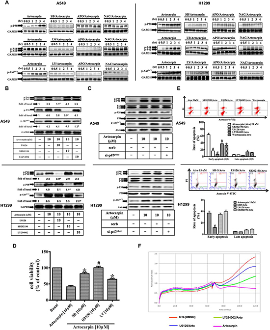 Figure 3: ROS-dependent MAPKs activation is involved in artocarpin-induced apoptosis in A549 and H1299 cells. Cells were treated with 10 μM artocarpin for different periods of time, followed by Western blot analysis using antibodies against phospho-p38 MAPK, phospho-ERK1/2 or phospho-Akt. (A) Western blot analysis showing the effects of 10 μM SB202190 (p38 inhibitor), 10 μM U0126 (ERK1/2 inhibitor), 10 μM LY294002 (PI3K inhibitor), APO (100 μM) or NAC (100 μM) on the phosphorylation of p38 MAPK, ERK1/2 or Akt in artocarpin-treated A549 and H1299 cells. The blots were probed for GAPDH as a loading control. (B) Cross talk between MAPKs and Akt phosphorylation in artocarpin-treated A549 and H1299 cells. Cells were pretreated with 10 μM SB202190, 10 μM U0126 or 10 μM LY294002 for 1hr and then treated with 10 μM artocarpin for 4 hr. (C) Relationship between MAPKs, Akt and p47phox in artocarpin-treated A549 and H1299 cells. Cells were transfected with either scrambled siRNA or p47phox siRNA and then treated with 10 μM artocarpin for 4 hr. (D, E) Cells were pretreated with10 μM SB202190, 10 μM U0126 or 10 μM LY294002 for 1 h, and then treated with 10 μM artocarpin for 24h. Cytotoxicity was determined using MTT assay and stained with Annexin-V and PI as previously described in Figure 1. Data shown are means ± SEM. *P < 0.05, #P < 0.01, compared to artocarpin treatment alone. (F) Real-time cytotoxicity assay to assess the effect of U0126 and LY294002 on artocarpin-induced cell cytotoxicity in A549 cells. Artocarpin was added at the 65 hour time point.