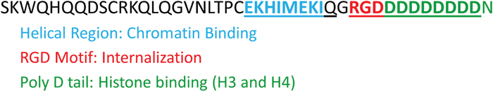 Figure 1: Amino acid sequence of the Lunasin peptide. Lunasin is a 44 amino acid peptide with 3 functional domains attributed with its anticancer activity: 1) a helical regional conserved in chromatin-binding proteins (blue), 2) a RGD motif recognized by integrins (red), and 3) a poly-aspartic acid tail involved in histone-tail binding (green).