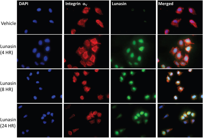 Figure 2: Lunasin is readily internalized by A375 melanoma cells. A375 cells treated with Lunasin for up to 24 h internalized Lunasin, which was found to colocalize with integrin αV subunits. Additionally, we observed nuclear localization of Lunasin that persisted after 24 h of treatment. We also observed the clustering of integrin subunits around the nucleus when A375 cells were treated with Lunasin suggesting the endocytic mechanism for Lunasin internalization involved integrins. Representative images from three independent experiments were used, and were taken at 40x magnification. (Blue = dapi, green = Lunasin, red = integrin αV).