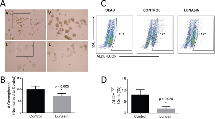 Figure 3: Lunasin disrupted oncosphere formation and reduced ALDHhigh populations. B16-F10 ALDHhigh cells were plated in low adherent culture in stem cell media and allowed to form floating oncospheres. When media was amended with 100 μM Lunasin, we observed a significant decrease in oncosphere formation compared to control samples (A, B). V = vehicle, L = Lunasin. ALDH activity was measured as previously described. When B16-F10 cells were treated with Lunasin, we observed a significant reduction in cells displaying the ALDHhigh phenotype (C, D). Figures represent data obtained from three independent experiments and are shown as mean ± s.d. Statistical significance (p < 0.05) was determined by student’s t-test and denoted by an asterisk (*).