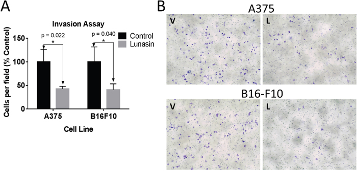 A375 and B16-F10 cells were sorted to isolate populations with elevated ALDH activity. These cells were pretreated with 100 μM Lunasin for 24 h, and subsequently replated in the upper chamber of transwell inserts containing serum-free DMEM/F12 media amended with PB or Lunasin. After adding media containing 10% FBS to the lower chamber, plates were incubated for 24 h, and the cells invading through the Matrigel basement membrane were counted. Invasion of A375 and B16-F10 ALDHhigh cells was significantly inhibited in Lunasin-treated wells compared to vehicle-treated wells resulting in a 57% (p = 0.02) and 60% (p = 0.04) decrease in invading cells, respectively (Figure 4A). Representative images showing the Toluidine-stained invading cells from the bottom of the inserts illustrate the anti-migratory effects of Lunasin in vitro (Figure 4B).