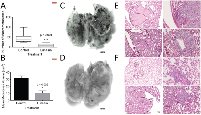 Hematoxylin and eosin (H&E) stained lung sections also showed an observable difference in the average area of micrometastases between treatment groups. Control mice had an average lesion area of 31.6 mm2 compared to 10.3 mm2 in the Lunasin group (Figure 5B). Micrometastases formed in the lungs of vehicle treated mice (Figure 5E) were larger and more abundant than in mice treated with Lunasin (Figure 5F). Cellular morphology was similar in lesions found in the lungs of both control and Lunasin-treated mice.