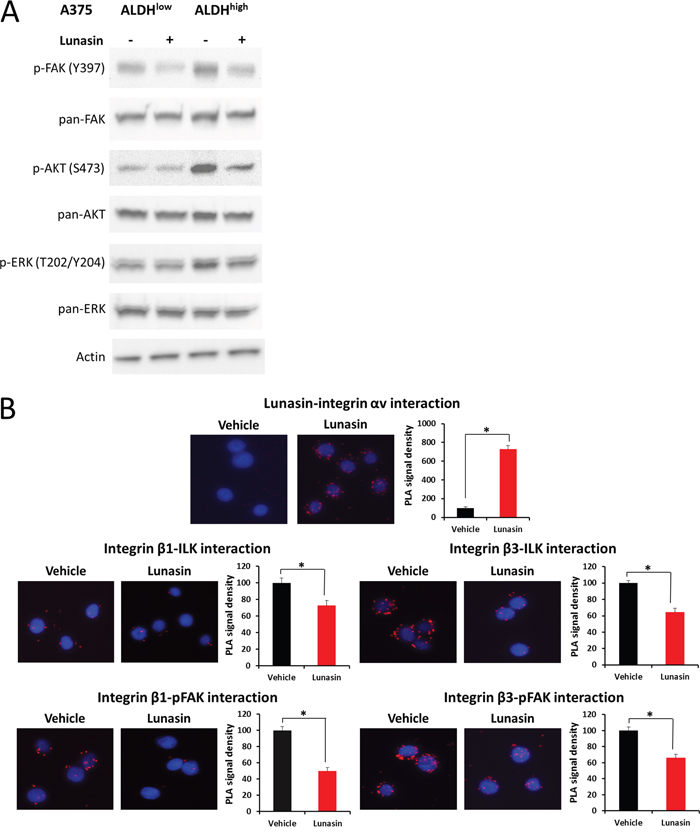 Figure 6: Lunasin suppressed integrin signal transduction. ALDHhigh and ALDHlow cells derived from the A375 melanoma cell line were treated with 100 μM Lunasin in low adherent culture for 24 h, and the resulting lysates were probed for integrin-associated signaling proteins (A). We observed a significant difference in phosphorylation patterns of FAK, AKT, and ERK in ALDHhigh cells, while only a modest effect was observed in ALDHlow cells (A). Actin was used as a reference protein. Additionally, we used PLA assays to validate that Lunasin was targeting integrin signal transduction. Our results suggest Lunasin decreased the interactions between integrin β subunits and the intracellular kinases FAK and ILK (B). Furthermore, we show that Lunasin specifically interacts with the RGD-recognizing αV integrin subunit (B).