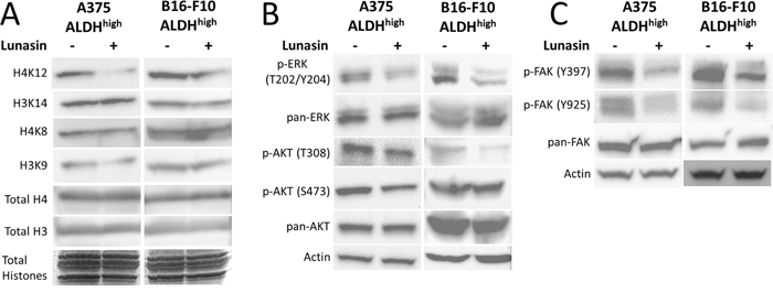 Figure 7: Lunasin inhibited phosphorylation of FAK, AKT, and ERK as well as histone acetylation. ALDHhigh cells derived from human A375 and murine B16-F10 melanomas were treated with Lunasin for 24 h, and the resulting cell lysates were subjected to SDS-PAGE and probed for integrin-associated signaling pathways. We observed a decrease in histone acetylation at H3K9 and H4K12 (A), which suggests epigenetic modification may play a role in Lunasin’s effects on melanoma CICs. As previously shown, these changes are concomitant with inhibition of activating phosphorylations of AKT (B), ERK (B), and FAK (C). Actin was used as a reference protein for all immunoblot analysis.