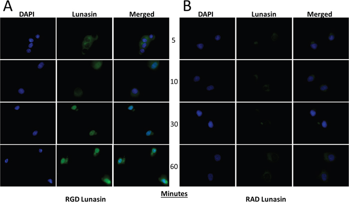 Figure 9: Lunasin uptake is an integrin-dependent process. RGD (A) and RAD (B) Lunasin peptides were incubated with A375 cells for various time points up to 1 h. While some RAD-Lunasin was detected, cells treated with RGD-Lunasin (native) showed significantly more abundant intracellular localization as illustrated by a significantly increased fluorescent signal. Additionally, we observed that native Lunasin (i.e. RGD) was localized in the nucleus of A375 cells after just 10 minutes, while RAD-Lunasin was detected mainly in the cytoplasm. Images are representative of data obtained from two independent experiments, and were analyzed using ImageJ software.
