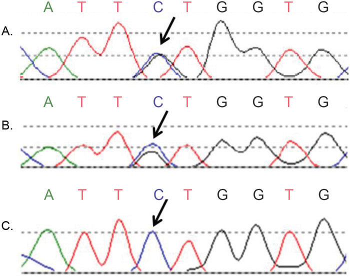 Figure 1: Discordant Sanger sequence results of CTNNB1 exon 3 (case 2). (A, B) Two tumour blocks showed a c.110C>CG mutation, indicated by the arrows; (C) The third tumour block of the same endometrial cancer patient was wildtype at the same position.
