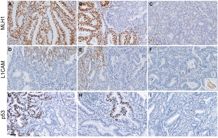 Figure 2: Representative figures of discordant MLH1, L1CAM and p53 protein expression in three endometrium carcinoma cases. Upper panels show discordant MLH1 expression: intact MLH1 staining (A), subclonal loss (B) and complete loss of MLH1 staining (C) in three blocks of case 3. Middle panels show discordant L1CAM staining in case 5: >10% L1CAM expression in two tumour blocks (D, F) and <10% in the third tumour block (E). The inset in (F) represents a L1CAM-positive nerve (positive control) within the same slide. Lower panels show wildtype+ p53 staining patterns with focal overexpression in <10% of the tumour in two tumour blocks (G, H) and wildtype p53 expression in the third block (I) in case 8. Scalebar represents 50 μm.