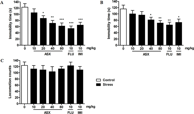 Figure 1: Effects of trans-astaxanthin (ASX) on the immobility time in the forced swim test (A), tail suspension test (B) and locomotor activity (C). The immobility time of force swim test and tail suspension test were assessed 1h after administration of vehicle, ASX (10, 20, 40 and 80 mg/kg, i.g.), imipramine (IMI, 10 mg/kg, i.p.) or fluoxetine (FLU, 10 mg/kg, i.p.). Values were evaluated by one-way ANOVA followed by Student-Newman-Keuls test and expressed as mean ± SEM (n=10 per group). *p<0.05, **p<0.01 and ***p<0.001 vs. the vehicle-treated group.