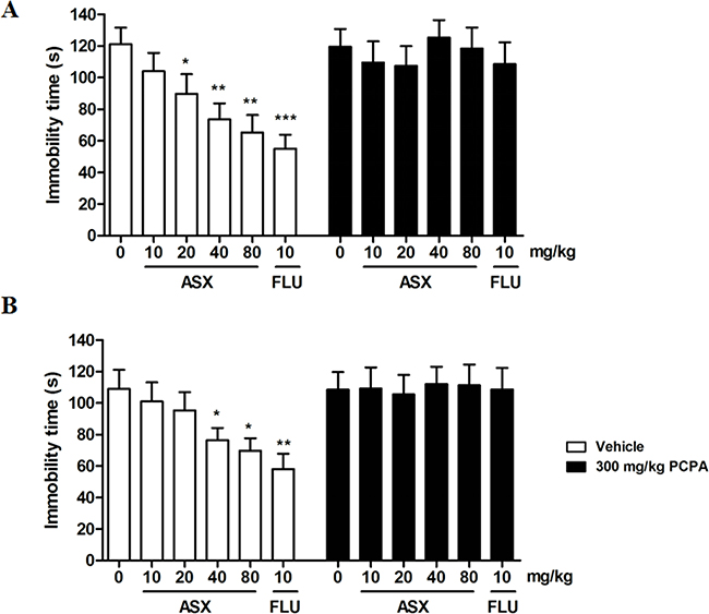 Figure 2: Effects of ASX on the immobility time of pre-treatment with PCPA in the forced swim test (A) and tail suspension test (B). Before ASX treatment, mice were pretreated with PCPA (300 mg/kg, i.p.) and vehicle once a day for three consecutive days. The immobility time of force swim test and tail suspension test were assessed 1h after administration of vehicle, ASX (10, 20, 40 and 80 mg/kg, i.g.), imipramine (IMI, 10 mg/kg, i.p.) or fluoxetine (FLU, 10 mg/kg, i.p.). Values were evaluated by one-way ANOVA followed by Student-Newman-Keuls test and expressed as mean ± SEM (n=10 per group). *p<0.05, **p<0.01 and ***p<0.001 vs. the vehicle-treated group.