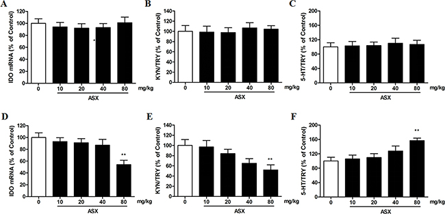 Knowledge of the acute mechanisms underlying the action of antidepressant drugs led to the general belief that the effective antidepressant medications act by increasing the activity of the monoaminergic system [17]. Here, we demonstrated that trans-astaxanthin was consistently effective when evaluated in two behavioral tests, and this antidepressant-like effect was accompanied by the restoration of acute stress induced alterations in brain monoamine transmitters, including serotonin and noradrenaline. Furthermore, our data also revealed that trans-astaxanthin may has an inhibitory effect on IDO activity.