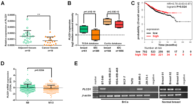 Figure 1: Expression of PLCD1 in breast cancer cell lines and breast cancers. (A) Expression of PLCD1 in a panel of breast cancer tissues matched with adjacent normal breast tissue samples measured by quantitative RT-PCR with β-actin as an internal control. Data were based on at least three independent assays. Means ± SD, n = 19, **p<0.01. (B) Expression of PLCD1 (log2 median-centered intensity) in normal breast tissues and invasive ductal carcinomas (IDC) analyzed using the Oncomine microarray database, The Cancer Genome Atlas (TCGA) and the Curtis microarray database. (C) The prognostic value of PLCD1 expression on overall survival (OS) analyzed by Kaplan-Meier Plotter (http://www.kmplot.com) in breast cancers (hazard ratio [HR] = 0.78 (0.63−0.97), p = 0.024). (D) Expression of PLCD1 in N0 (Lymph node without metastasis, n = 232) and N1-3 (Lymph node with metastasis, n = 226) breast cancers was analyzed in The Cancer Genome Atlas (TCGA) database using the cBioPortal for Cancer Genomics (http://www.cbioportal.org/; p = 0.0264). (E) Expression of PLCD1 in a panel of breast cancer cells and three normal breast tissues was detected by RT-PCR with β-actin as an internal control.