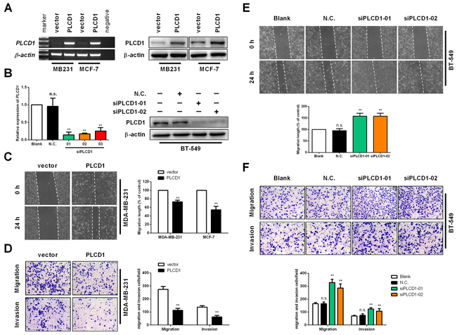 Figure 2: PLCD1 inhibits cell migration and invasion in vitro. (A) MDA-MB-231 and MCF-7 cells transfected with vector and PLCD1 plasmid at 2 weeks after selection with geneticin. Expression of PLCD1 was measured by both RT-PCR and immunoblotting. (B) BT-549 cells transfected with siRNAs siN.C. and siPLCD1 at 72 h. Expression of PLCD1 was measured by both quantitative RT-PCR and immunoblotting. (C) Confluent monolayers of MDA-MB-231 and MCF-7 cells expressing PLCD1 (or vector-only control cells) were scratched and migration distance measured over a 24 h period by phase-contrast microscopy. Representative wound healing assays are shown on the left. Means ±SD, **p<0.01. (D) PLCD1/MDA-MB-231 cells and vector-only controls cells migrated to the lower side of the chamber or invaded through the Matrigel barrier to the lower side of the chamber. Cells were fixed, stained and counted by phase-contrast microscopy. Five random fields were taken for each chamber. Representative cell migration assays and cell invasion assays are shown on the left. Means ±SD, **p<0.01. (E) Confluent monolayers of BT-549 cells (wild type, siN.C., siPLCD1-01, and siPLCD1-02) were scratched and migration measured by phase-contrast microscopy. Means ±SD, **p<0.01. (F) BT-549 cells (wild type, siN.C., siPLCD1-01, siPLCD1-02) after migration or invasion. Cells in the lower side of the chamber were fixed, stained, and counted in five random fields for each chamber. Means ±SD, **p<0.01.