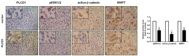 Figure 4: Expression of PLCD1, pERK1/2, active-β-catenin and MMP7 in MDA-MB-231 xenografts in nude mice (magnification ×400). Data were based on at least three independent assays, and representative images were shown in the left panel. Means ± SD, **p<0.01.