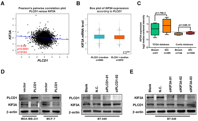 Figure 5: PLCD1 suppresses KIF3A in breast cancer. (A) Correlation between the expression of PLCD1 and KIF3A in breast cancer analyzed by Breast Cancer Gene-Expression Miner v4.0 (bc-GenExMiner v4.0) (r = −0.09, p<0.0001, n = 5164). (B) Expression of KIF3A in cells expressing high (PLCD1>median) and low (PLCD1≤median) amounts of PLCD1 (p<0.0001). (C) Expression of KIF3A (log2 median-centered intensity) in normal breast tissues and invasive ductal carcinomas (IDC) analyzed using the Oncomine microarray database, the Cancer Genome Atlas (TCGA) and the Curtis microarray database. (D) PLCD1-expressing cells and vector-only control cells (MDA-MB-231, MCF-7) and BT-549 cells transfected with siN.C. and siPLCD1 for 72 h. KIF3A protein levels were measured by immunoblotting with β-actin as an internal control. Data were based on at least three independent assays, and representative images were shown. (E) BT-549 cells transfected with siN.C. and siKIF3A for 72 h. KIF3A and PLCD1 protein levels were measured by immunoblotting with β-actin as an internal control. Data were based on at least three independent assays, and representative images were shown.