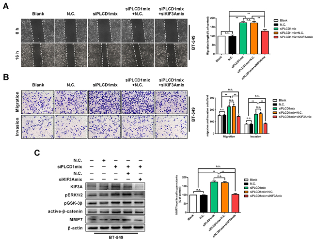 Figure 7: KIF3A acts as a downstream mediator of PLCD1. BT-549 cells transfected with siN.C. or siPLCD1 were also transfected simultaneously with (or without) siKIF3A for 72 h. (A) Cell migration assays. Confluent cell monolayers were scratched and migration distance was measured over a 16 h period by phase-contrast microscopy. Representative wound-healing assays are shown on the left. Means ± SD, **p<0.01. (B) Cell invasion assays. BT-549 cells migrated to the lower side of the chamber or invaded through the Matrigel barrier. Cells were fixed, stained and counted using an inverted microscope. Five random fields were taken for each chamber. Representative cell migration and cell invasion assays are shown on the left. Means ±SD, **p<0.01. (C) Immunoblotting of KIF3A, pERK1/2, pGSK-3β, active-β-catenin, and MMP7 protein levels with β-actin as an internal control. Supernatant MMP7 levels were also measured by ELISA. Data were based on at least three independent assays, and representative images were shown. Means ± SD, **p<0.01.