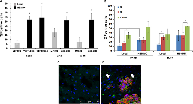 Figure 1: CCR4 is upregulated in brain-tropic melanoma cells. (A) FACS analysis for CCR4 expression by local melanoma variants compared to brain metastasizing melanoma variants (HBMMC) from 3 different melanomas (YDFR, M-12, M-16). Graphs show the average % positive cells in three independent experiments, *p < 0.05. (B) FACS analysis for CCR4 expression of local and of brain metastasizing melanoma cells (HBMMC). Melanoma cells grown in 3D cultures (3D) express higher levels of CCR4 than cells grown in 2D cultures (2D). Addition of microglia-derived soluble factors to melanoma cells grown in 3D cultures (3D+MG) upregulated the expression of CCR4 even more. Graphs show the average % positive cells in three independent experiments, *p < 0.05. (C–D) Brain sections of normal mice (C) and of mice inoculated via the intra-cardiac route with 1 × 106 mCherry-HBMMC (D). Brain sections were stained by immunofluorescence for CCR4 (green). Melanoma macrometastases are red and cell nuclei are blue (DAPI), Magnification: ×63. Scale bar = 75 μm (C), Scale bar = 50 μm (D). Arrows indicate CCR4 expressing stromal cells in the brain microenvironment.