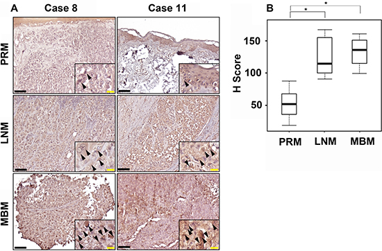 Figure 2: CCR4 expression during melanoma progression to brain metastasis. (A) Representative IHC staining with anti-CCR4 antibody for PRM, LNM and MBM specimens. Black bars indicate 100 μm. The insets show a magnification of the melanoma lesions. Black arrowheads indicate CCR4-positive melanoma cells. Yellow bars indicate 20 μm. (B) Box plot comparing H score for PRM, LNM and MBM. *P ≤ 0.05.