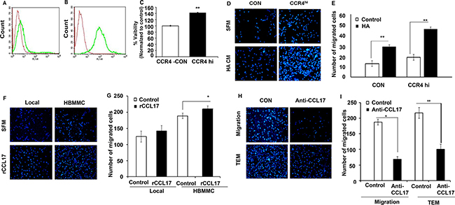 Figure 4: CCR4 ligands secreted by human stromal brain cells induce melanoma cell migration. (A–B) FACS analysis for CCR4 expression by local melanoma cells infected with empty plasmid (CON- red) (A), or with CCR4 cDNA (CCR4hi-green) (B). (C) Viability (XTT-based assay) of control (CON) cells and of CCR4 over-expressing melanoma cells (CCR4hi). (D–I) Migration assays.(D) Representative images of migrated CCR4hi and CON cells following 24 h incubation with astrocyte-derived soluble factors (conditioned medium - HA CM) as compared to cells that were allowed to migrate towards serum free medium (SFM). (E) Quantification of (D). (F) Representative images of migrated local and brain metastasizing melanoma cells (HBMMC) 24 h following incubation with 10 ng/ml recombinant CCL17 (rCCL17). (G) Quantification of (F). (H–I) Neutralizing anti –CCL17 Ab reduce melanoma cell migration and transendothelial migration (TEM). (I) Melanoma cells were incubated with HA CM (control) or with HA CM supplemented with 1 μg/ml neutralizing Ab to CCL17. Representative images of migration assays are shown. I Quantification of (H). Data shown are mean pixel density normalized to control (SFM). Experiments were performed in triplicate and four independent fields/well were quantified. *P < 0.05 **P < 0.005, n = 3.