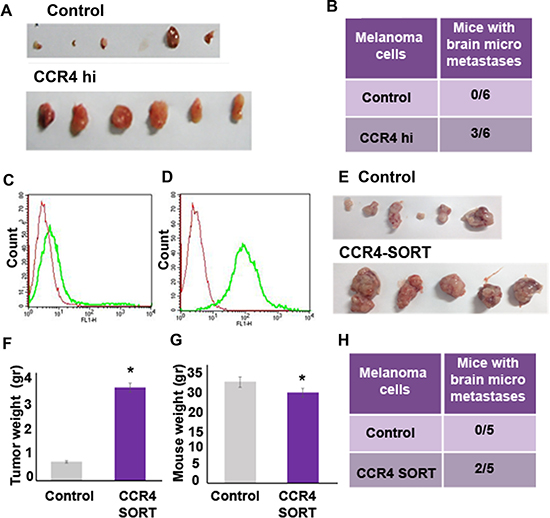 Figure 5: CCR4 promotes growth of cutaneous melanoma tumors and of brain metastasis. The following two types of CCR4 overexpressing cells and their corresponding controls were s.c inoculated into nude mice: 1. Cells infected with CCR4 cDNA (CCR4hi) or control cells (empty plasmid). 2. FACS sorted cells for high CCR4 expression: Control cells (un sorted) or CCR4-sorted cells (CCR4-SORT). 12 wks following inoculation, local tumors were excised and brains were removed and analyzed for metastasis formation. (A) Tumors of the CCR4hi and Control mouse groups. (B) Brain micrometastasis in the CCR4hi and Control mouse groups (n = 6). (C) CCR4 expression in unsorted cells. (D) CCR4 expression in CCR4-sorted cells. Red-negative control, Green-CCR4. (E) Tumors of the CCR4-SORT and Control mouse groups. Tumor weight (gr) (F) and mouse weight (gr) (G) of mice injected with unsorted control cells or with CCR4-SORT cells. (H) Brain micrometastasis in the CCR4-SORT and Control mouse groups (n = 5). qRT-PCR was used to determine the percentage of human melanoma cells in mouse brains.