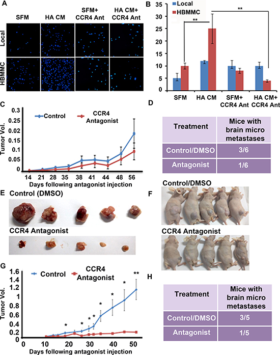 Figure 6: CCR4 antagonism ameliorates the malignancy phenotype of melanoma. (A–B) The CCR4 antagonist reduces melanoma cell migration. Local and HBMMC were incubated in serum-free medium (SFM), SFM supplemented with migration-stimulating astrocyte-derived soluble factors (HA CM), SFM + 10 μM CCR4 antagonist, SFM supplemented with HA CM and 10 μM CCR4 antagonist. (A) Representative images of migrated local and HBMMC cells following 24 h incubation (B) Quantification of A. Data shown are number of migrated cells counted cells in four independent fields/well; **p < 0.005, ***p < 0.0005. (n = 3). (C–D) CCR4 over-expressing melanoma cells (CCR4hi) were s.c inoculated into nude mice. Two wks post cell inoculation mice were treated, twice a week, with CCR4 antagonist (1.5 μg) or with DMSO (vehicle Control). 12 wks following inoculation local tumors were excised and brains were removed and analyzed for metastasis formation. (C) Tumors of antagonist-treated and control mice. (D) Brain micrometastasis in antagonist-treated and control mice (n = 6). (E) CCR4-sorted melanoma cells were s.c inoculated into nude mice. One wk post cell inoculation mice were treated, every 2 days, with CCR4 antagonist (1.5 μg) or with DMSO (Control). 12 wks following inoculation local tumors were excised and brains were removed and analyzed for metastasis formation. (F) Antagonist-treated and control mice. (G) Tumors of antagonist-treated and control mice. (H) Brain micrometastasis in antagonist-treated and control mice (n = 5).