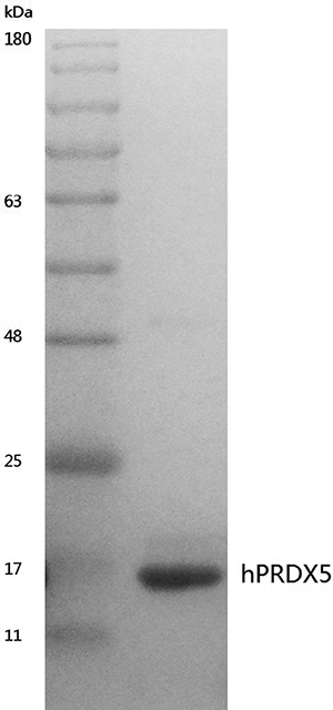 Figure 1: Coomassie stained SDS-PAGE gel of purified hPRDX5. The DNA fragment of hPRDX5 was constructed to expression vector pET-28a(+) and the plasmid was then transformed to BL21 (DE3) for heterogeneous expression. The hPRDX5 was purified by Affinity Chromatography and the molecular weight was about 17 kDa.