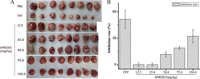 Figure 2: The anti-cancer bioactivity of hPRDX5 in C26-injected mice. (A) Tumors were harvested after treated with hPRDX5 and controls (TPT and PBS). (B) The inhibition rate of tumor was evaluated by measuring the tumor weight compared with solvent control. The tumor growth was decreased significantly in mice treated with hPRDX5 in a dose-dependent manner. The highest inhibition rate was 32.16 %, which demonstrated that hPRDX5 was likely to a potential tumor suppressor. (P < 0.05 compared to control group).