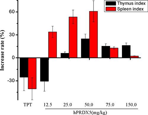 Figure 3: Effects of hPRDX5 on spleen and thymus indices in C26-injected mice. The spleen and thymus indices were increased significantly compared with control group when the mice were given intraperitoneal injection of hPRDX5 at 12.5, 25.0, 50.0, 75.0 or 150.0 mg/kg, respectively (P < 0.05 compared to control group).