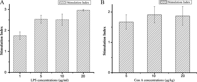 Cell proliferation was assessed as described by Swamy SM et al [43]. Splenocytes were obtained by gently placing the organ in RPMI-1640 medium (Sigma, USA) under aseptic conditions, followed by filtration and centrifugation (1000 rpm for 5 min) at room temperature. The erythrocytes were removed by hemolytic Gey’s solution, while the remaining cells were centrifuged at 1000 rpm for 5 min. After two washes, the splenocytes were re-suspended in RMPI-1640 medium containing 10% fetal bovine serum (FBS), and adjusted to 1 × 107 cell/ml. 100 μl of splenocyte suspension (1 × 107 cell/ml) in a 96-well culture plate was cultured in RPMI-1640 medium containing 10% fetal bovine serum (FBS) with the addition of mitogens (LPS at 5, 10, 20 μg/ml or concanavalin A at 1, 5, 10, 20 μg/ml) (Sigma, USA). After incubation for 72 h at 37°C in a humidified 5% CO2 incubator, the number of proliferating cells was determined after centrifugation (1500 rpm for 10 min) by MTT assay [44] at a wavelength of 570 nm. The stimulation index was calculated by the following equation: Stimulation index = ODtest/ODcontrol.