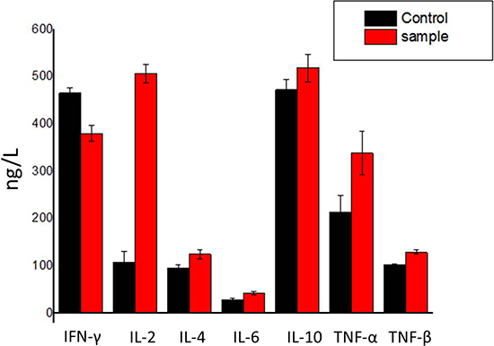 Cytokines play an important role in cell-cell communication in the immune system. Thereupon, we determined the effects of hPRDX5 on the levels of cytokines. The levels of interleukin-2 (IL-2), interleukin-4 (IL-4), interleukin-6 (IL-6), interleukin-10 (IL-10), tumor necrosis factor-α (TNF-α) and tumor necrosis factor-β (TNF-β) increased significantly except interferon-γ (IFN-γ) reduced slightly (Figure 5), which indicated that hPRDX5 could promote the secretion of IL-2, IL-4, IL-6, IL-10, TNF-α and TNF-β. Therefore, we speculate that hPRDX5 has regulatory effects on inflammation and lymphocyte functions through these cytokines secretion to possess its anti-cancer activities.