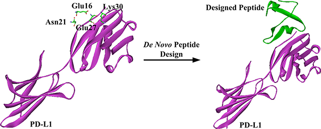 Based on the previously proposed sites of PD-L1 residues important for the inhibitor binding [37, 38], we carried out a modeling study to investigate the potential interaction between hPRDX5 and PD-L1. In the predicted model, almost all the key interactions between hPRDX5 and the binding site of PD-L1 are conducted by the four conservative residues (Glu16, Asn21, Glu27 and Lys30) in hPRDX5 (Figure 6): For example, there are three hydrogen bonds between Lys30 of hPRDX5 and Tyr123 of PD-L1, Asn21 of hPRDX5 and Pro24 of PD-L1, and Arg95 of hPRDX5 and Asp122 of PD-L1. The conservative nature of these residues in hPRDX5 and other PRDX enzymes suggests that their important roles in forming the binding interface with PD-L1. Based on the current modeling results, the in vivo investigation on the potential interaction between hPRDX5 and PD-L1 is being carried on, which will be published in the near future. Furthermore, the identified residues of hPRDX5 are important to help in designing small peptides which can act as protein-protein interaction inhibitors with lower manufacturing costs and higher stability (Figure 7) for clinical therapeutic applications. This model provides the tool to fully use this unique immunotherapeutic pathway and rationally develop more effective and safer peptide inhibitors to block the protein-protein interactions involved in this pathway.