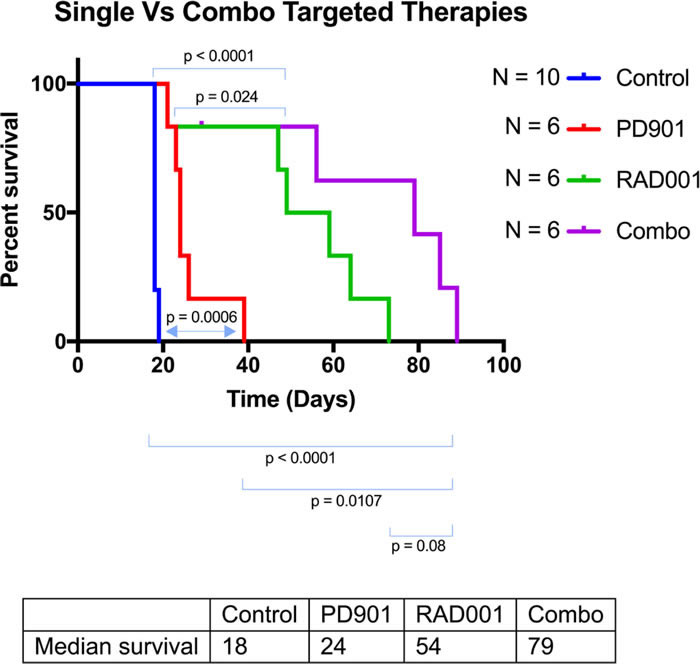 Figure 1: Kaplan-Meyer of the different treatment cohorts of the Genetically Engineered Peripheral Nerve Sheath Tumor mice. These Dhh-Cre; Ptenfl/fl; Nf1fl/fl mice were injected with a PBS control IP, PD0325901 (0.5mg/kg IP thrice weekly), RAD001 (5mg/kg thrice weekly IP), or combination PD032590/RAD001. Control group mice displayed a median survival of 18 days. PD901 treatment modestly improved this to 24 days with a p value of 0.0006. RAD001 treatment improved this response even more profoundly, increasing the longevity to a median of 54 days with a p value of <0.0001. Finally, combination treatment showed an additive effect, increasing survival to 79 days (p<0.0001).