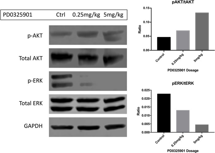 Figure 2: Phosphorylated ERK is diminished in response to increasing dosing of PD0325901 in the trigeminal nerves of Dhh-Cre; Ptenfl/fl; Nf1fl/fl mice. In this western blot, activated ERK is diminished when PD901 was administered IP acutely 2 hours before sacrifice (Cell Signaling 4377S). At 5mg/kg, signal was ablated completely. In a contrasting manner, p-AKT (Cell Signaling 4075S) levels seemingly increased in the trigeminal nerves in a dose-dependent fashion. This correlates with a potential signaling feedback and resistance mechanism of monotherapeutic targeted treatment. Quantifications for phospho-AKT/total-AKT and phospho-ERK/total-ERK are pictured on the right panel.