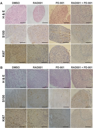 Everolimus and PD-901 were solubilized in DMSO and then subsequently diluted in PBS and sterilized. Mice were weighed daily and given 10 mg/kg/day of Everolimus or 5 mg/kg/day of PD-901. For combination studies mice were given 5 mg/kg/day of Everolimus and 2.5 mg/kg/day of PD-901 at the same time. Mice were weighed and monitored daily, and sacrificed when they became moribund. Tumors, nerves, and organs were harvested for immunohistochemistry and western blot analysis. All animal work was conducted according to the University of Minnesota’s approved animal welfare protocol.