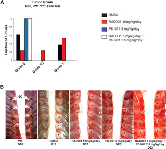 Figure 5: Tumor grade and size is reduced when the spontaneous MPNST mouse model is treated with Everolimus (RAD001) and PD-901 in combination. A. Vehicle control (DMSO) treated mice have approximately 50% high grade tumors (grade 2/3 and 3) and 50% low grade tumors (grade 1-2). Treatment with Everolimus reduces the fraction high grade tumors and increases the fraction of lower grade 1 tumors, with some enlarged dorsal root ganglia were even categorized as nerve hyperplasia. Treatment with PD-901 did not change the fraction of high or low grade tumors. Treatment with the combination of Everolimus and PD-901 most dramatically reduced tumor grade resulting in all tumors being assessed as low grade. B. Example images of dorsal root ganglia (DRG) tumors in the spontaneous MPNST mouse model with various treatments. DMSO treated mice have nearly every DRG highly enlarged, while Everolimus or PD-901 treatments reduce the size and number of enlarged DRGs. The combination treatment of Everolimus and PD-901 most effectively reduces the size of DRGs in the spontaneous MPNST mouse model. Astrisks denotes DRG nerve; Arrow heads indicate tumors of the dorsal root ganglia; SC, spinal cord.