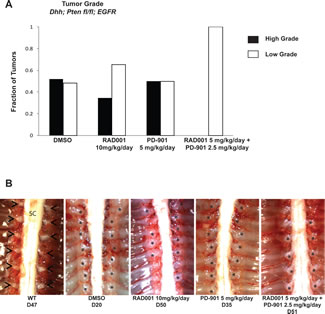 Treatment with Everolimus and PD-901 in combination in the NF1-asssociated mouse model extended lifespan and dramatically reduced tumor burden, although all tumors that were analyzed at necropsy were grade 2, as assessed by H & E, S100, and Ki67 as described above (Figure 2A, 2C, 3A, 4A). Importantly, the DRG tumors from mice treated with the combination therapy were somewhat smaller at necropsy (Figure 4B). In contrast, combination treatment of Everolimus and PD-901 in the spontaneous mouse model resulted in all low grade tumors (Figure 3B, 5A). Additionally, fewer enlarged DRG were observed, and those seen in this model were quite small (Figure 5B).