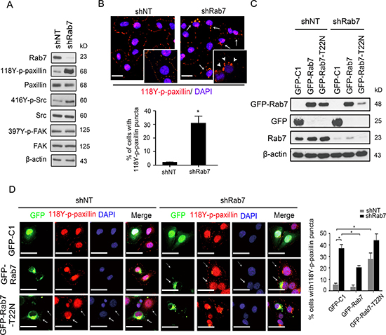 Figure 2: Rab7 and its GTPase activity are required for paxillin accumulation into cytosolic puncta. (A) Lysates from shNT or shRab7-expressing BT-20 cells were immunoblotted with antibodies against Rab7, LC3B, 118Y-p-paxillin, paxillin, 397Y-p-FAK, FAK416Y-p-Src, Src and β-actin as an internal control. (B) Top: shNT and shRab7 transfected BT-20 cells were fixed and stained with anti-118Y-p-paxillin antibody (red) and with DAPI (blue). Solid arrows identify cells with 118Y-p-paxillin puncta. Arrowheads in inserts (65x magnification) indicate actual 118Y-p-paxillin puncta. Bottom: percentage of cells with 118Y-p-paxillin puncta. Data are presented as mean ± SEM (*p < 0.05, n = 3). (C and D) BT-20 cells expressing shNT and shRab7 plasmids and their matched cells rescued with empty (GFP-C1), shRNA-resistant Rab7 (GFP-Rab7) or Rab7 with a point mutation (GFP-Rab7-T22N) plasmids, were lysed and immunoblotted with anti-GFP antibody (C) or were fixed and stained with anti-118Y-p-paxillin antibody (red) and with DAPI (blue). Scale bar, 20 μm. Solid arrows indicate the cell expressing GFP plasmids and dashed arrows indicate cells without expressing GFP plasmids (D, left). (D, right) Graph shows the quantification of percentage of cells with 118Y-p-paxillin in intracellular puncta (determined using lower magnification images (20 ×)). Data are presented as mean ± SEM (*P < 0.05, n = 3)