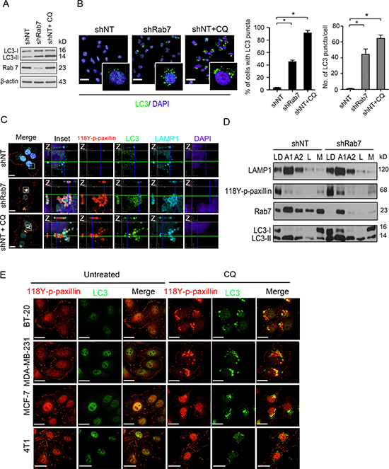 Figure 3: Knockdown Rab7 mimics the effect of chloroquine to localize paxillin into autophagolysosomes. (A–C) Control (shNT), Rab7-silenced (shRab7) and control treated with 20 μM chloroquine (CQ) for 24 h (shNT+CQ) BT-20 cells lysed and immunoblotted with antibodies against Rab7, LC3B and β-actin (internal control) (A), fixed and stained with anti-LC3 antibody (green) and with DAPI (blue) with 20 μm scale bar left (insert 63X) and quantification on the right panel showed percentage of cells with LC3 puncta and average # of LC3 puncta/cell (N = 15) (B). Data are presented as mean ± SEM (*p < 0.05, n = 6)) or further co-stained with anti-118Y-p-paxillin antibody (red), anti-LC3B antibody (green), anti-LAMP-1 antibody (cyan) and with DAPI (blue) with 20 μm scale bar (C). Enlargements and cross-sections of the confocal-z-planes of the boxed regions are also shown indicating association of 118Y-p-paxillin, LC3B and LAMP-1. (D) Lysed shNT and shRab7-expressing BT-20 cells were subjected to nycodenze gradient centrifugation, then analyzed by immunoblotting using anti-LAMP1, anti-118Y-p-paxillin, anti-Rab7 and anti-LC3 antibodies. LD is the loading control, A1 and A2 are autophagosome-related fractions, L is the lysosomal fraction and M is the mitochondrial fraction. (E) MDA-MB-231, BT-20 and MCF-7 cells were treated either with PBS (untreated) or CQ for 24 h, then fixed and stained with anti-118Y-p-paxillin or anti-416Y-p-Src antibodies (red) and anti-LC3 antibody (green). Scale bar, 20 μm.