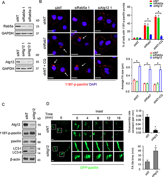 Figure 4: The autophagic pathway regulates Rab7-mediated paxillin turnover. (A) BT-20 cells were transiently transfected with 100 nM non-targeted (siNT), Rab5a (siRab5) or Atg12 (siAtg12) siRNA for 48 h and total protein was extracted then immunoblotted with antibodies against Rab5a, Atg12 and anti-GAPDH as an internal control. (B) Left, shNT, shRab7 and shNT treated with CQ (shNT+CQ) BT-20 cells were respectively transfected with non-targeted, Rab5a or Atg12 siRNA for 48 h and stained with anti-118Y-p-paxillin antibody (red) and DAPI (blue). Arrows indicate the cells with 118Y-p-paxillin puncta. Scale bar, 20 μm. Right top, quantification of the percentage of cells with 118Y-p-paxillin puncta. Data are presented as mean ± SEM (*p < 0.05, n = 3). Right bottom, quantification of average of FA size. Data are presented as mean ± SEM (*p < 0.05, n = 10 cells) (C) shNT BT-20 cells were transfected with either 100nM siNT or siAtg12 for 48 h, then immunoblotted with antibodies against Atg12, 118Y-p-paxiilin, paxillin, Rab7, LC3B and anti-β-actin used as an internal control. (D) Left: Serum-starved siNT or siAtg12 BT-20 cells transfected with GFP-paxillin for 24 h were plated on chamber slide, stimulated by 20 ng/ml EGF and then analyzed for FA turnover by time-lapse spinning disc microscopy. Scale bar, 2 μm. Higher-magnification images of the inserts are also shown indicating positions of paxillin-containing FAs. Right: FAs disassembly and FA life time in siNT and siAtg12 cells were quantified (mean ± SEM, n = 75 FAs in siNT and 88 FAs in siAtg12 from 10 single cells, *p < 0.05).
