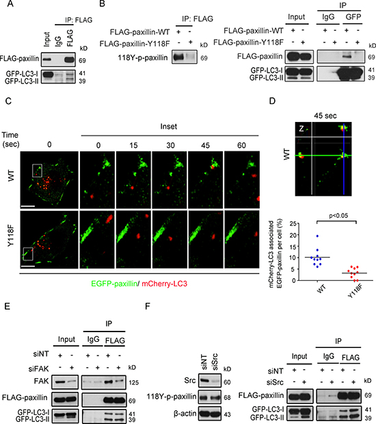 Figure 6: Tyrosine 118 phosphorylation of paxillin modulates its association with the autophagic marker LC3 at cell plasma membrane protrusions. (A) BT-20 cells were transfected with FLAG-paxillin and GFP-LC3 plasmids for 24 h and immunoprecipitated with either anti-IgG or anti-FLAG antibodies. Lysates were then immunoblotted with anti-FLAG and anti-GFP antibodies. (B) Left: FLAG protein was immunoprecipitated from BT-20 cells transfected with either wild-type FLAG-paxillin (FLAG-paxillin-WT) or FLAG-paxillin with point mutation at amino acid 118 (FLAG-paxillin-Y118F) for 24 hours and immunoblotted with anti-118Y-p-paxillin antibody. Right: BT-20 cells were transfected with either FLAG-paxillin-WT or FLAG-paxillin-Y118F and GFP-LC3 plasmids for 24 h and immunoprecipitated with either anti-IgG or anti-GFP antibodies. Lysates were then immunoblotted with anti-FLAG and anti-GFP antibodies. (C) BT-20 cells were transfected with either EGFP-paxillin wild-type (WT) or EGFP-paxillin-Y118F (Y118F) plasmids (green) and mCherry-LC3 plasmids (red) for 24 h, then plated on chamber slide. Next, cells were monitored for the trafficking of EGFP-paxillin and mCherry-LC3 by time-lapse spinning disc microscopy. Scale bar, 5 μm. Higher-magnification images of the inserts are also shown indicating path of EGFP-paxillin and mCherry-LC3 at cell protrusions. (D) Top, Enlargements and cross-sections of the confocal-z-planes of the boxed regions are also shown indicating association of EGFP-paxillin-WT and mCherry-LC3 at 45 sec. Bottom: quantification of the percentage of dynamic EGFP-paxillin labeling FAs per cell targeted by mCherry-LC3. Scatter plot shows individual single cells and mean line. n = 125 mCherry-LC3 vesicles targeted to FA in EGFP-paxillin WT and 169 mCherry-LC3 vesicles targeted to FAs in EGFP-paxillin-Y118F group from 10 single cells. (E) siRNA silenced FAK BT-20 cells were transfected with FLAG-paxillin and GFP-LC3 plasmids for 24 h and immunoprecipitated by either anti-IgG or anti-FLAG antibodies. Lysates were then immunoblotted with anti-FAK, anti-FLAG and anti-GFP antibodies. (F) Left: BT-20 cells were transiently transfected with non-targeted or Src siRNA proteins were extracted, and then immunoblotted with anti-Src, anti-118Y-p-paxillin and anti-β-actin antibodies. Right: FLAG-paxillin was immunoprecipitated from siNT and siSrc cells expressing FLAG-paxillin and GFP-LC3, then immunoblotted with anti-FLAG and anti-GFP antibodies.