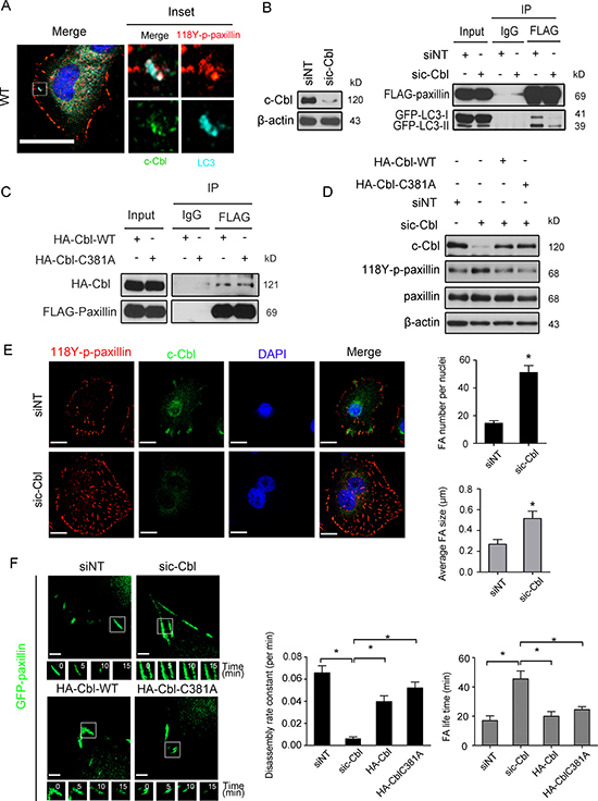 Figure 7: c-Cbl is the major cargo receptor mediating LC3 interaction with paxillin. (A) BT-20 cells were fixed and stained for anti-118Y-p-paxillin antibody (red), anti-LC3B antibody (cyan), anti-c-Cbl antibody (green) and with DAPI (blue). Scale bar, 20 μm. Enlargements of the boxed regions are also shown indicating association of 118Y-p-paxillin, LC3B and c-Cbl. (B) Left: BT-20 cells were transfected with either NT or c-Cbl siRNA for 48 h, then immunoblotted with anti-c-Cbl anti-β-actin antibodies. Right: BT-20 cells were transfected with non-targeted or c-Cbl siRNA for 24 h and then transfected with FLAG-paxillin and GFP-LC3 plasmids for another 24 h and immunoprecipitated by either anti-IgG or anti-FLAG antibodies. Lysates were then immunoblotted with anti-FLAG and anti-GFP antibodies. (C) BT-20 cells were transfected with either HA-Cbl wild-type plasmids (HA-Cbl-WT) or HA-Cbl with point mutation on a.a 381. (HA-Cbl-C381A) for 24 h and immunoprecipitated by either anti-IgG or anti-FLAG antibodies. Lysates were then immunoblotted with anti-FLAG and anti-HA antibodies. (D) BT-20 cells were transfected with non-targeted or c-Cbl siRNA for 24 h and then were either rescued by HA-Cbl-WT or HA-Cbl-C381A plasmids. After 24 h, cells were lysed and immunoblotted with antibodies against c-Cbl, 118Y-p-paxillin, paxillin and anti- β-actin as an internal control. (E) Left, BT-20 cells transfected with non-targeted or c-Cbl siRNA for 48 h were stained with anti-118Y-p-paxillin antibody (red), c-Cbl antibody (green) and DAPI (blue). Scale bar, 20 μm. Right, quantification of FA number per cells and average FA size. Data are presented as mean ± SEM (*p < 0.05, n = 10 cells) (F) Left: Serum-starved siNT or sic-Cbl BT-20 cells rescued with either HA-Cbl wild-type plasmids (HA-Cbl-WT) or HA-Cbl with point mutation on a.a 381 (HA-Cbl-C381A) were transfected with GFP-paxillin for 24 h, then plated on chamber slide, stimulated by 20 ng/ml EGF and analyzed for FA turnover by time-lapse spinning disc microscopy. Scale bar, 2 μm. Higher-magnification images of the inserts are also shown indicating positions of paxillin-containing FAs. Right: FAs disassembly rate and FA life time in siNT, sic-Cbl. sic-Cbl+ HA-Cbl-WT and sic-Cbl+ HA-Cbl-C381A cells were quantified (mean ± SEM, n = 44 FAs in siNT, 38 FAs in sic-Cbl, 45 FAs in HA-Cbl rescued and 52 FAs in HA-Cbl-C381A groups from 10 single cells, *p < 0.05).