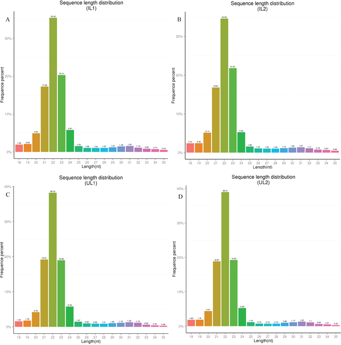 Figure 1: Length distribution of the small RNA expressions in the liver of domestic cats infected with Toxoplasma gondii compared to control cats. (A and B) Group 1 and group 2 of T. gondii-infected domestic cats; (C and D) Group 1 and group 2 of uninfected, control, domestic cats. Abbreviations: IL1, IL2, UL1, and UL2: infected liver 1, infected liver 2, uninfected liver 1, uninfected liver 2, respectively.