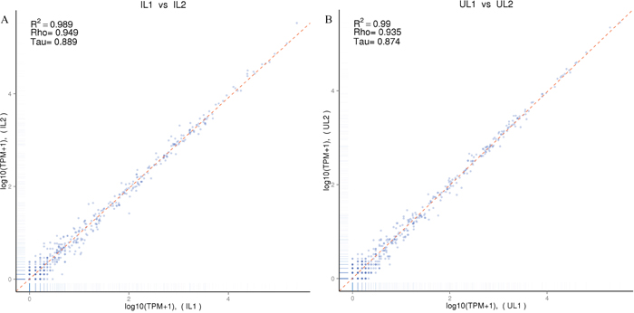 Figure 2: Correlation analysis of the small RNA expressions in the livers of T. gondii-infected and uninfected cats. (A) Correlation analysis of small RNA expression levels between T. gondii-infected cats of group 1 and group 2 (IL1 vs IL2); (B) Correlation analysis of small RNA expression levels between uninfected cats of group 1 and group 2 (Ul1 vs UL2).