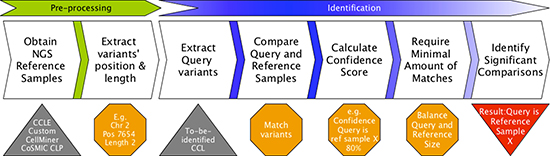 The usual way of establishing the identity of a CCL sample under study (from now on called query sample q) is to compare it to CCLs whose identity is known (from now on called R, a library of reference samples) by experimentally comparing certain cell line specific features [1, 3, 5, 6, 8]. Established identification methods differ in the characteristic genomic entity that is compared between q and the samples in R. While Short Tandem-Repeat analysis (STR) compares counts of tandem-repeats [6], the Single-Nucleotide-Polymorphism Panel Identification Assay (SPIA) compares the zygosities of distinct diploid single-nucleotide polymorphisms (SNPs) [4]. Both methods require additional and costly experiments which do not contribute to the scientific goal of the original study. Furthermore, in all available methods the genotyping-technology – including the subsequently used software – applied to analyze the query q and to analyze the references R must be identical for achieving the expected accuracy. This implies access to the physical samples, which is difficult in large projects with numerous partners where often only information on samples or data generated from these is exchanged, but not the samples themselves.