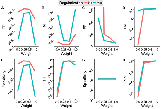 Figure 3: Results of the cross-identification benchmark depending on regularization and variant inclusion weight. (A) Number of false positives. (B) Number of false negatives. (C) Number of false positives. (D) Number of true negatives. (E) Sensitivity. (F) F1-Score (harmonic mean of specificity and sensitivity). (G) Specificity. (H) Positive Predictive Value. Best specificity and sensitivity values are achieved using a weight threshold of 0.5. A threshold of 1.0 achieves the least false positives, most true negatives, and the highest positive predictive value.