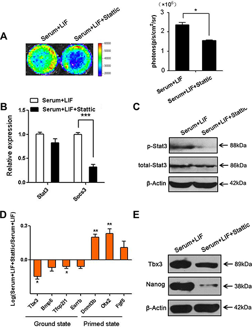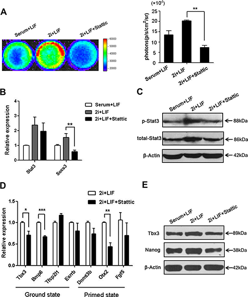 Figure 4: Stattic repressed the phosphorylation of Stat3 and relative gene expression. (A) Renilla luciferase imaging showed p-Stat3 with LIF and Stattic after 48 hours. Histogram showed the quantified Renilla luciferase activity. (n = 3; *p < .05, **p < .01, ***p < .001). (B) Real-time PCR analysis of Stat3 and the downstream target gene Socs3 with Stattic (p-Stat3 inhibitor) treatment. Images were taken after 48 hours in LIF and Stattic. (n = 3; *p < .05, **p < .01, ***p < .001). (C) Western blot analysis of total Stat3 and p-Stat3 after Stattic stimulation for 48 hours. The figure shows representative data from three independent experiments. (D) Real-time PCR analysis of ground state genes (Tbx3, Bmp7, Tfcp21l and Esrrb) and primed state genes (Dnmt3b, Otx2 and Fgf5) after Stattic treatment for 48 hours. (n = 3; *p < .05, **p < .01, ***p < .001). (E) Western blot analysis of ground state marker Nanog and Tbx3 after Stattic stimulation for 48 hours. The figure shows representative data from three independent experiments.