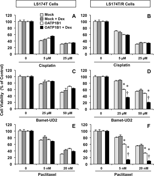 Figure 5: Antiproliferative effect of cisplatin (A, B) Bamet-UD2 (C, D) and paclitaxel (E, F) in LS174T cells (A, C, E) and the partially chemoresistant subline LS174T/R (B, D, F). Both cell types were transduced with lentiviral vectors, either empty (Mock) or containing Z3-MRP2pr-OATP1B1. Cells were incubated with anticancer agents with or without 100 nM dexamethasone (Dex) for 72 h. Values mean±SD from 3 independent experiments performed in triplicate are expressed as a percentage of untreated cells (Control). *, p<0.05 compared with Mock cells. †, p<0.05, on comparing with and without Dex treatment. The Bonferroni method of multiple range testing was used for comparisons among groups.