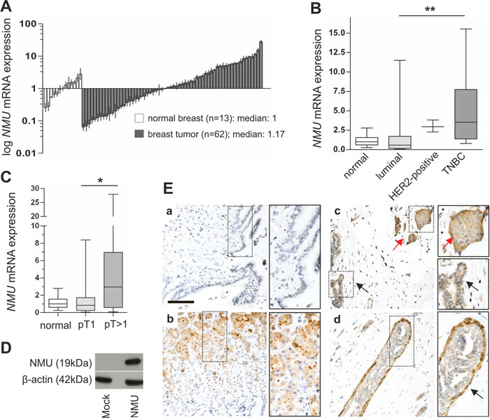 Figure 1: NMU expression in breast cancer and intrinsic subtypes. (A) Real-time PCR-based NMU mRNA expression analysis of 62 breast tumor samples compared to 13 healthy breast tissue samples. Vertical lines: ± standard error of margin (SEM). (B) Box plots of the samples shown in A demonstrating a significant increase in NMU mRNA expression in the IHC-defined TNBC cases compared with breast carcinomas of the luminal subtype. Horizontal lines: grouped medians. Boxes: 25-75% quartiles. Vertical lines: range, minimum and maximum, TNBC: triple negative breast cancer, ** P < 0.01 (Kruskal-Wallis test). (C) Box plot illustrating NMU up-regulation in breast tumors > pT1. Horizontal lines: grouped medians. Boxes: 25-75% quartiles. Vertical lines: range, minimum and maximum, * P < 0.05 (Kruskal-Wallis test). (D) Western blot detection of full length NMU protein in Hs578T cells transfected with either NMU expression vector or empty vector control. (E) No staining is observed in lung tissue (a) serving as negative control while strong NMU protein expression is present in basal glandular cells of the stomach (b). In the mammary tissue cytoplasmic NMU protein expression is enhanced in tumor cells (red arrow) compared with adjacent normal breast epithelial cells (black arrow) (c). NMU protein expression is pronounced in myoepithelial cells (arrow) of the breast (d). Scale bar: 100μm.