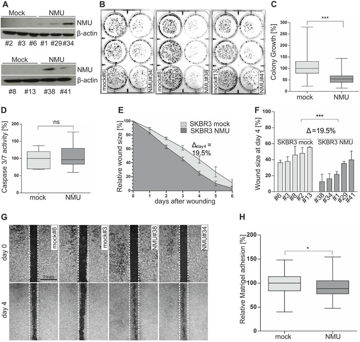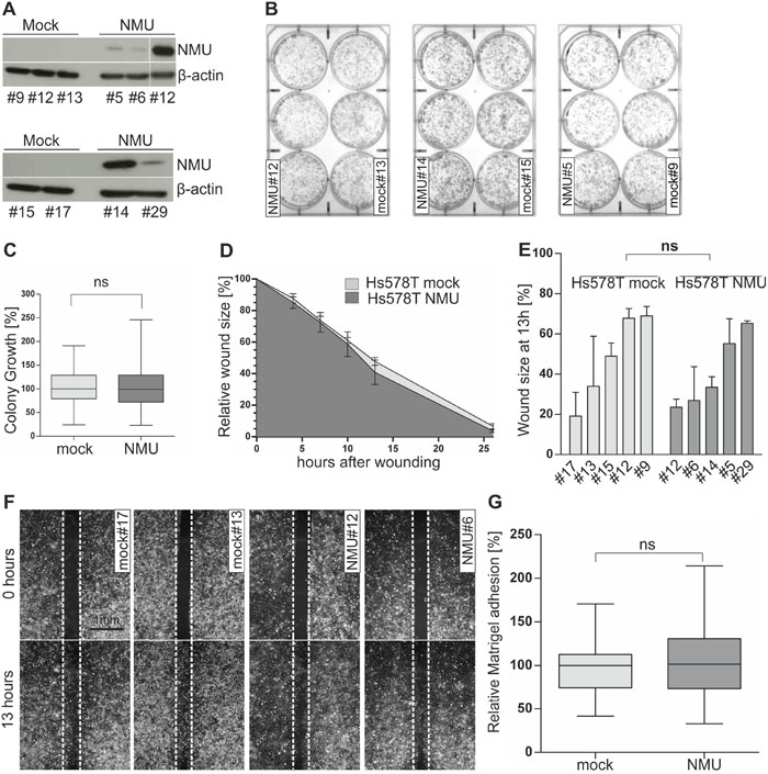 All transfections were performed using FuGene HD Transfection Reagent (Roche, Mannheim, Germany) following the manufacturer's instructions and either the pT-REx-DEST30 vector construct containing the full-length human NMU cDNA (Source BioScience LifeSciences, Nottingham, England) or the pT-REx-DEST30 empty vector (Invitrogen, Carlsbad, CA, USA) as control. Selection of stable NMU and empty vector single-cell clones was achieved by culturing SKBR3 and Hs578T cells in complete culture medium containing 0.8 mg/mL and 0.6 mg/mL G418 (Life Technologies, Darmstadt, Germany) respectively for at least two weeks to ensure genomic cDNA integration. Afterwards, isolated clones were analyzed by both real-time PCR and western blotting for expression of NMU.