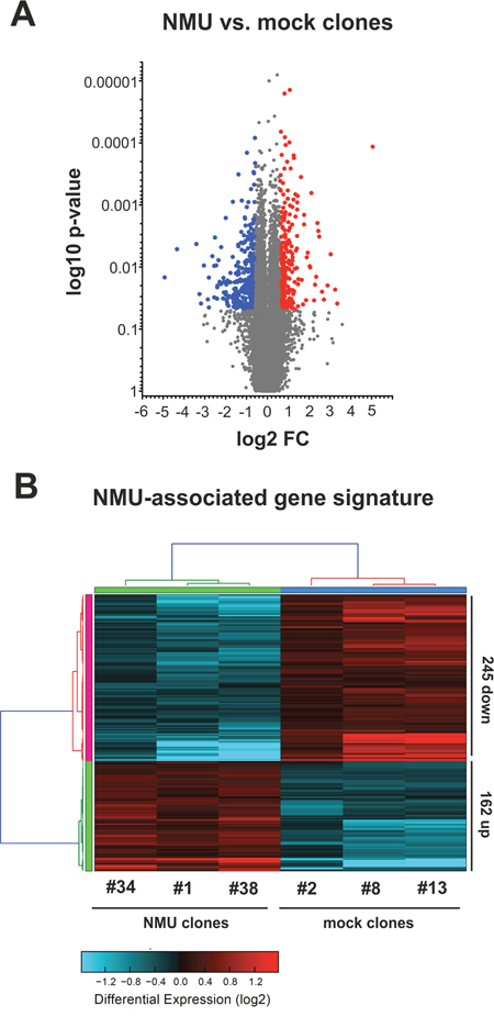 In a recent study NMU was described for the first time in human breast cancer as potential predictive biomarker for HER2-positive breast carcinomas and as a candidate therapeutic target to prevent metastatic spread [20]. However, this study lacked information about the subtype-specific expression pattern of NMU and its potential receptors in breast cancer tissues. Moreover, systematic insight into oncogenic mechanisms of NMU and modulated downstream signaling pathways in breast cancer remains elusive. Therefore we initially analyzed NMU expression in the different breast cancer subtypes. We performed a semi-quantitative NMU mRNA expression analysis of 62 breast cancer samples compared to 13 normal breast tissues. For cohort characteristics of analyzed samples see Supplementary File 1. Comparing all tumor samples to healthy controls, only a slight increase in NMU mRNA expression in tumor specimens was noted (median fold change (FC): 1.17) (Figure 1A). Classifying tumor samples by subtypes, i.e. “luminal”, “HER2-positive” and “triple-negative breast cancer (TNBC)” [22], based on immunohistochemistry (IHC) and fluorescence in situ hybridization (FISH) data for estrogen receptor (ER), progesterone receptor (PR) and human epidermal growth factor receptor 2 (HER2), revealed an increase in NMU mRNA expression in HER2-positive and triple-negative breast carcinomas (median FC: 3.0 and 3.5) (Figure 1B). The association between non-luminal breast cancer subtypes and NMU mRNA expression up-regulation was confirmed conducting Fisher’s exact test showing a highly significant negative correlation of both a positive ER and PR status with NMU mRNA expression (for both P < 0.01; Table 1). Furthermore, a positive correlation of high NMU mRNA expression and HER2-positive cases was found (P < 0.05; Table 1). Interestingly, NMU mRNA expression was also significantly enhanced in advanced tumors of larger size (median FC pT1 vs. pT>1: 3.5, P < 0.05) (Figure 1C).