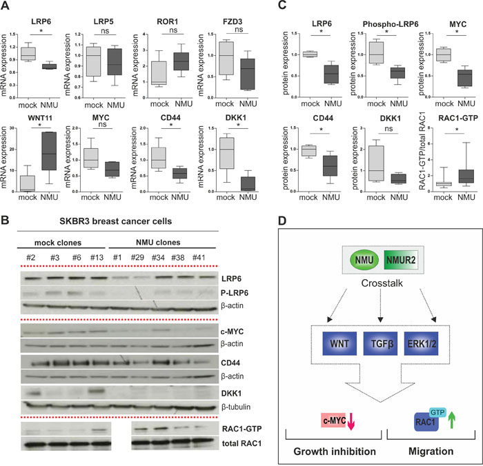 Total cell protein lysates of human breast cancer cell lines and tissue specimens were obtained by sonification of cells/tissues in an appropriate volume of 1×NuPAGE LDS Sample Buffer (Invitrogen, Carlsbad, CA) supplemented with 50mM dithiothreitol (Life Technologies, Darmstadt, Germany). Heat denatured samples were loaded on 4-12% gradient gels (NuPAGE; Invitrogen) and then transferred onto 0.2μm PVDF membranes (Whatman, Dassel, Germany) (1h, 100V) for immunodetection. Blots were blocked in TRIS-buffered saline (TBS) containing 0.1% Tween-20 (TBS-T) and either 5% non-fat dry milk (Merck, Darmstadt, Germany) or BSA (Roth, Karlsruhe, Germany) for 1h at room temperature. Blocked blots were then incubated with the primary antibody overnight at 4°C, diluted in blocking solution either containing 5% non-fat dry milk or BSA. The following primary antibodies were used: NMU (1:250, HPA025926, Atlas Antibodies, Stockholm, Sweden), β-actin (1:5000, A5441, Sigma-Aldrich, Deisenhofen, Germany), β-tubulin (1:500, ab6046, Abcam, Cambridge, UK), CD44 (1:1000, 156-3C11), MYC (1:1000, D84C12), DKK1 (1:1000, 4687), LRP6 (1:1000, C47E12), P-LRP6 (1:1000, 2568) (all Cell Signaling, Danvers, MA, USA). After washing three times (TBS + 0.05% Tween-20), blots were incubated with secondary peroxidase-conjugated antibodies (DAKO, Glostrup, Denmark) diluted in blocking solution containing 5% non-fat dry milk for 1h at room temperature. After washing three times (TBS + 0.05% Tween-20), antibody detection was accomplished with Pierce ECL Western blotting Substrate (Thermo Scientific, Rockford, IL, USA).